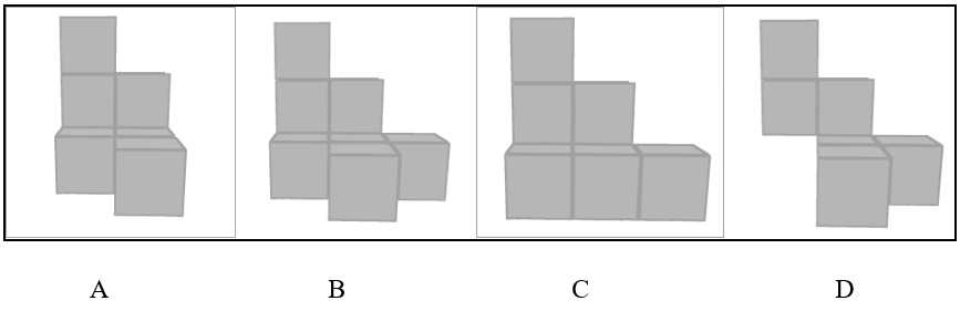 Typically, spatial reasoning is assessed through the use of image-based questions. Often, the test shows 3D images from a specific angle and asks the test taker to identify which of the multiple-choice answers represents the image from a separate viewing point.